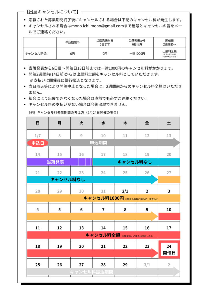 出展確定連絡後にキャンセルされる場合、下記の期間においてキャンセル料が発生します。 - キャンセルされる場合はすみやかにmono.ichi.mono@gmail.comまで屋号とキャンセルの旨をメールでご連絡ください。